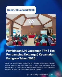 Pembinaan Lini Lapangan TPK (Tim Pendampingan Keluarga ) Kecamatan Kanigoro Tahun 2026 Muhammad Aris January 26, 2026 Agenda, Berita, Berita Photo, Galeri, Pengumuman Comments Off on Pembinaan Lini Lapangan TPK (Tim Pendampingan Keluarga ) Kecamatan Kanigoro Tahun 2026 54 Views Related Articles PEMBEKALAN PERSIAPAN REKRUTMEN PERANGKAT DESA GOGODESO 24 hours ago PENGAJIAN RUTIN RABU PAHING PAC MUSLIMAT NU 1 day ago Pendampingan Penyaluran Bantuan Pangan di Desa Jatinom 2 weeks ago Share Facebook Twitter Stumbleupon LinkedIn Pinterest